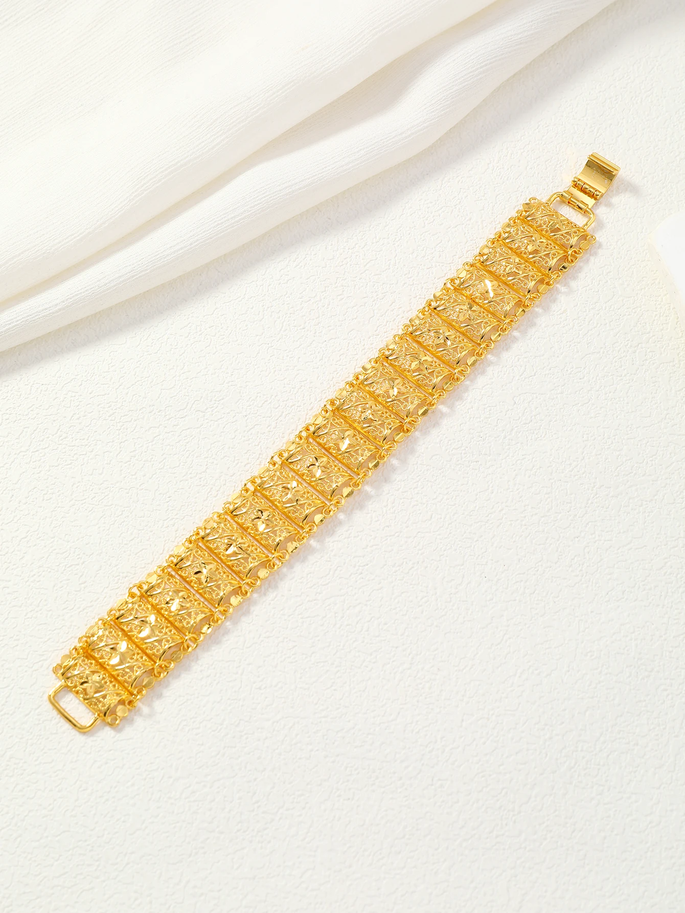Crafted in premium gold-plated alloy, this bracelet delivers a luxurious glow that complements both modern and traditional styles. Lightweight yet eye-catching, it’s perfect for daily wear, weddings, or special celebrations — adding a refined golden touch to any look.