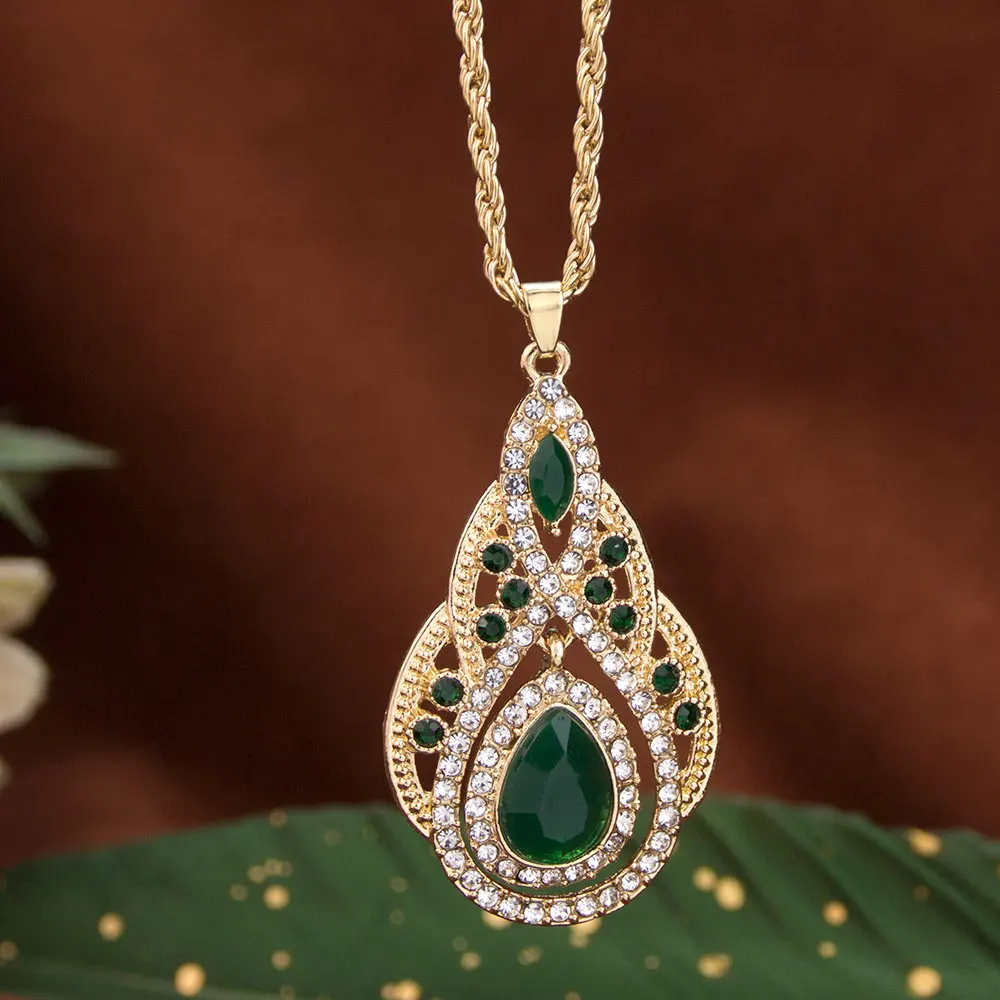 This stunning necklace features a water droplet–shaped crystal pendant surrounded by intricate Arabesque detailing, capturing the essence of Arabic beauty and sophistication. The perfect statement piece for parties, weddings, or special celebrations, it embodies rich tradition and modern elegance in one design.