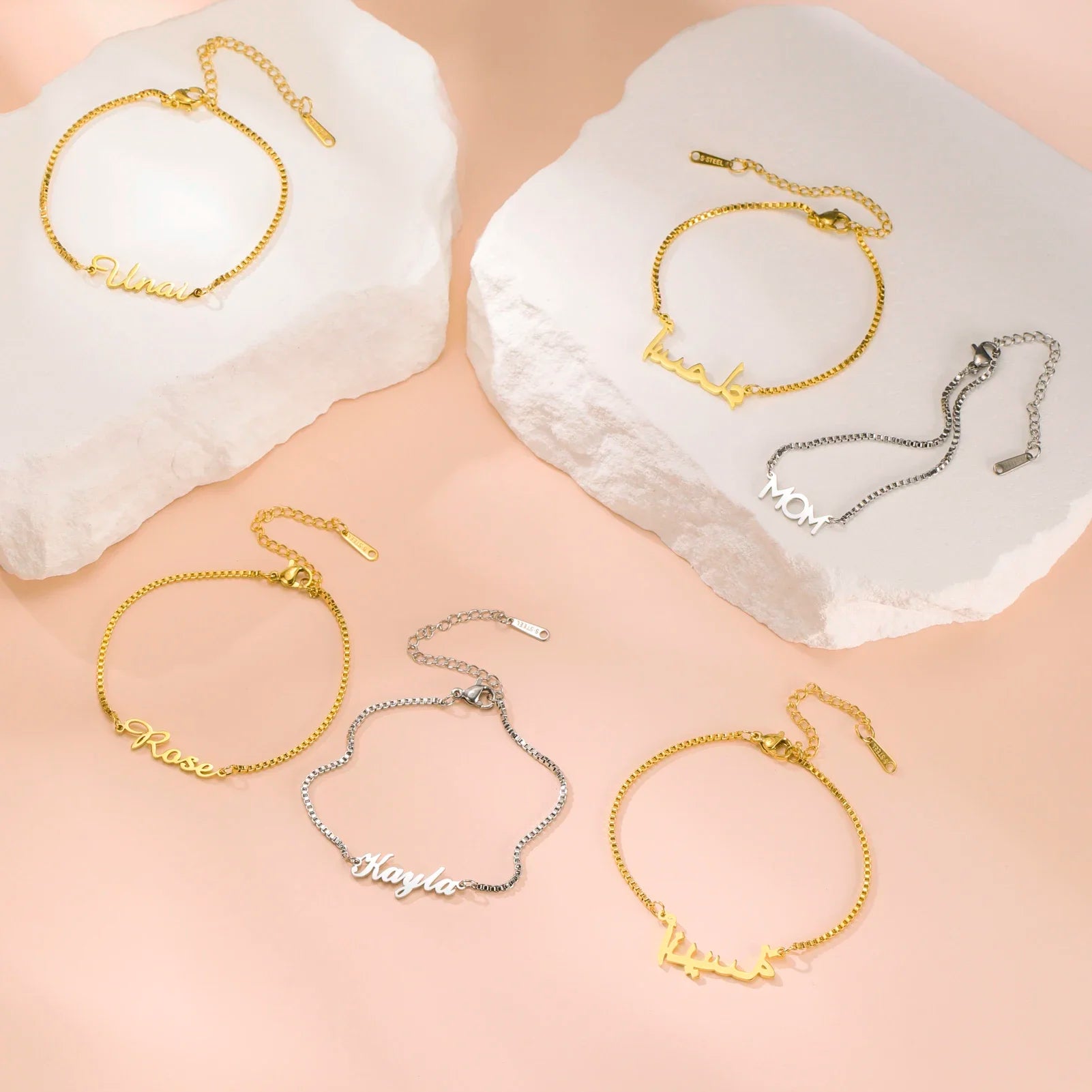 Create a meaningful and stylish accessory with this Women’s Personalized Name Bracelet, designed for girls and women who love custom jewelry. Made from durable stainless steel, this bracelet features a sleek box chain and customizable letter charms to spell any name or word.